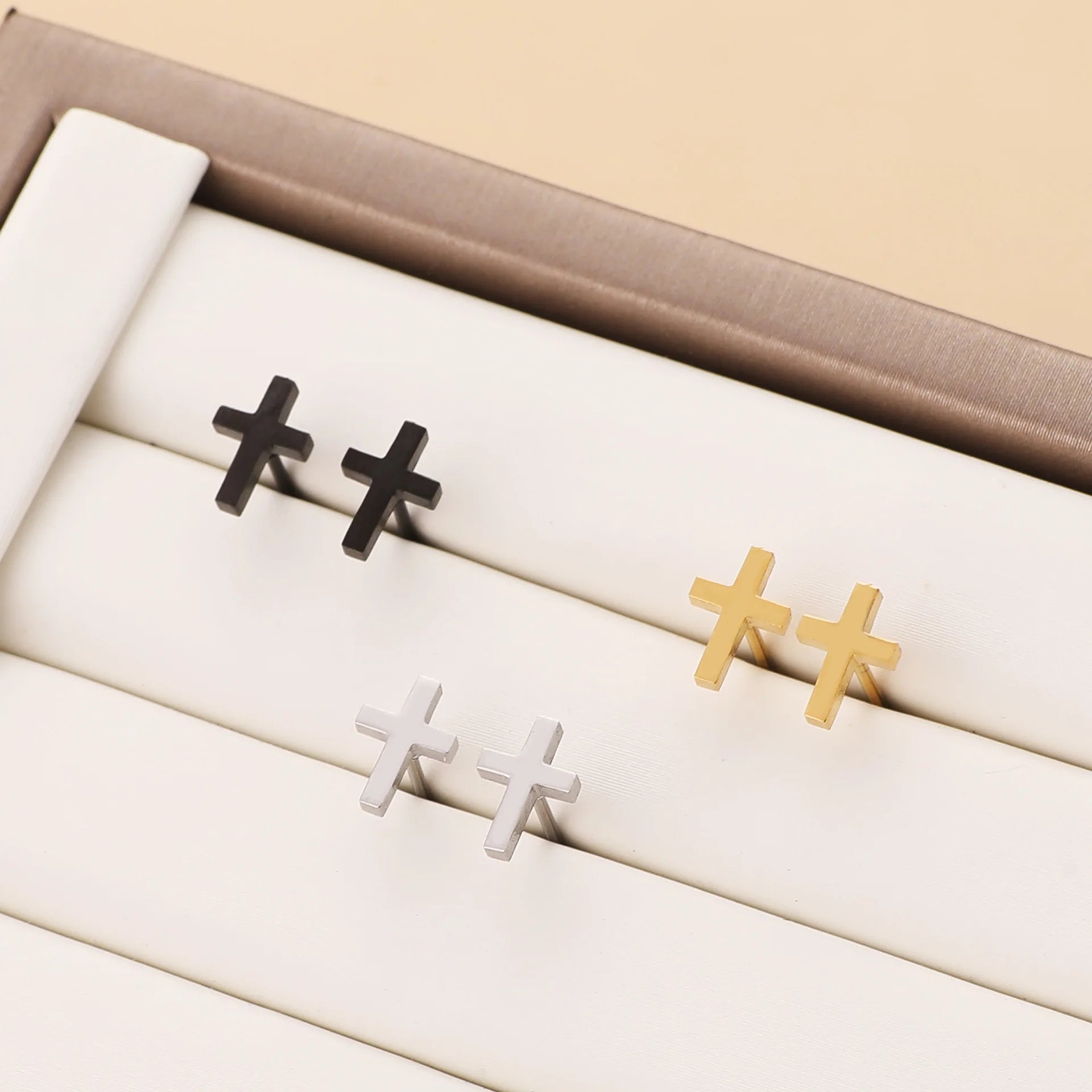 - Stylish stainless steel cross design in three colors: silver, gold, and black